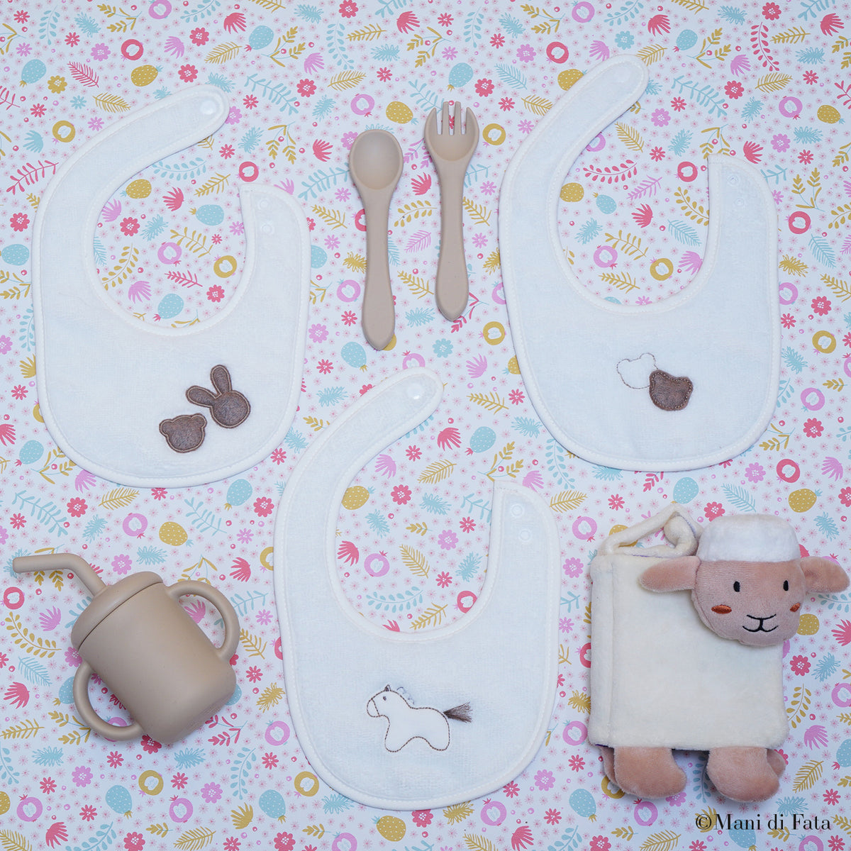 Bavetta rotonda che unisce dolcezza e praticità, realizzata in spugna di bamboo naturale per garantire la massima delicatezza sulla pelle del tuo bambino. La base bianca è impreziosita da applicazioni in beige, per un look elegante e raffinato, ideale da indossare ogni giorno ma anche nelle occasioni speciali.