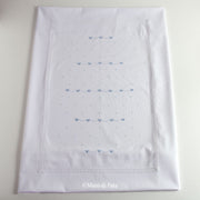 Copertina da lettino a sacco confezionata in piquet millerighe di puro cotone bianco sul davanti, possibilità di poter inserire l'imbottitura, impreziosita da ricamo realizzato a mano racchiuso in una cornice in pizzo di cotone, motivo del disegno fiocchi e pois. Il prodotto è realizzato in Italia.