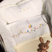 Lenzuolino da culla e da carrozzina completo di federina, confezionato in puro cotone bianco ed impreziosito da ricamo realizzato a mano, motivo del disegno divertenti pulcini che giocano nel prato. Finizione con pizzo in cotone e passanastro in raso di colore giallo. Il prodotto è realizzato in Italia.