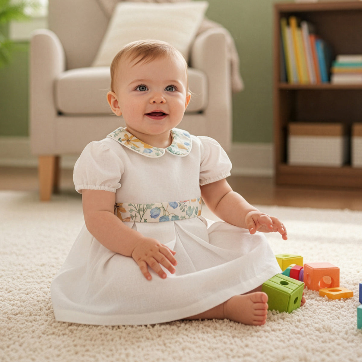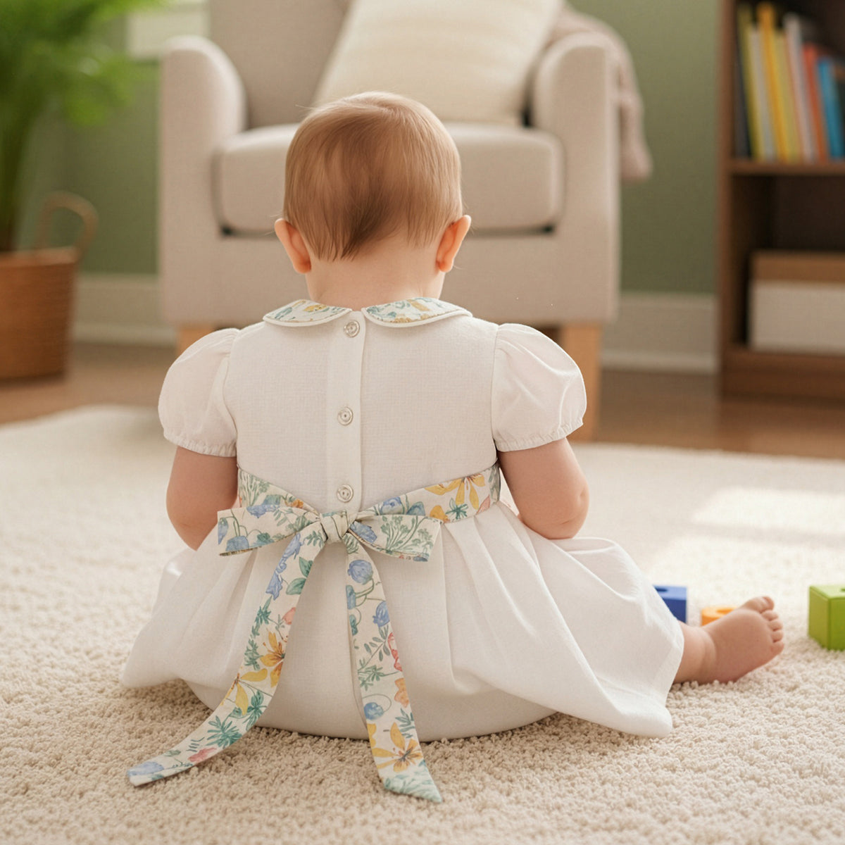 Abitino in misto lino bianco con colletto e cintura stampa Liberty
