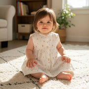 Abitino per bimba realizzato in garza di cotone, leggera e traspirante, ideale per la stagione estiva. Il modello senza maniche è impreziosito da una delicata stampa a piccoli fiori colorati, che dona al capo un aspetto dolce e raffinato.