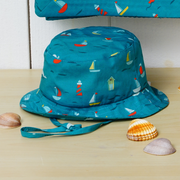 Cappellino da bimbo modello a secchiello con tesa circolare morbida, realizzato in popeline di cotone stampato con grazioso motivo di piccole barche a vela. È dotato di pratico laccetto da annodare sotto il mento per una migliore tenuta e comfort.