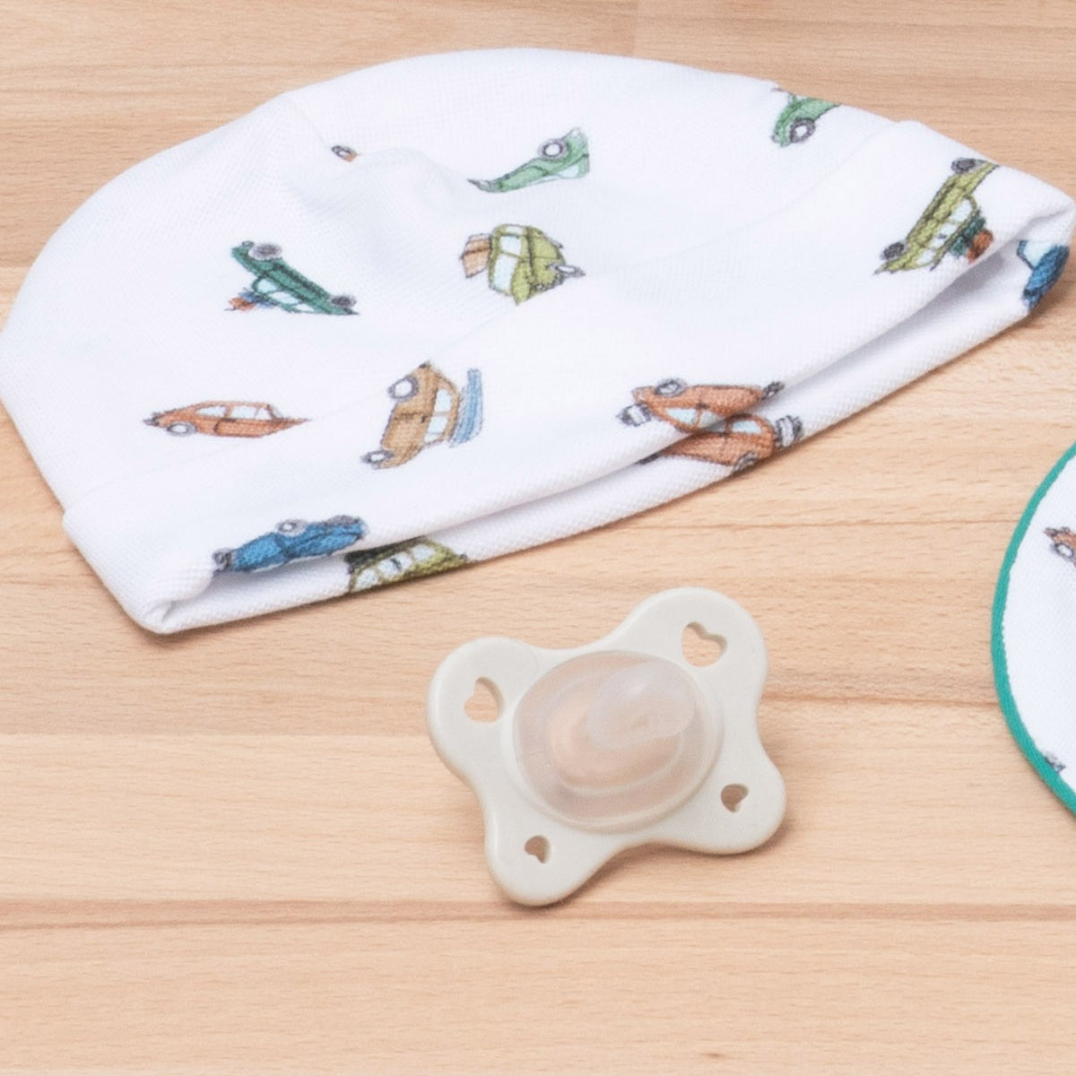 Delizioso cappellino per neonato realizzato in piquet di cotone con allegra stampa di piccole macchinine colorate su fondo bianco. Leggero e traspirante, è perfetto per proteggere la testa del bambino con comfort e stile.