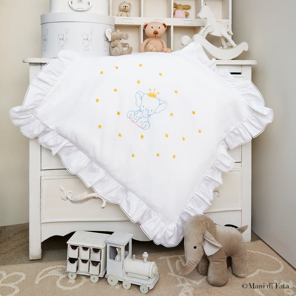 Copertina confezionata in piquet millerighe di cotone bianco di alta qualità. Elegante e delicata, è impreziosita da un ricamo eseguito a mano con dolce motivo di un simpatico elefantino con coroncina, circondato da piccole stelle. Le balze lungo i bordi e la raffinata finitura in pizzo completano il design con un tocco senza tempo. La copertina è dotata di apertura laterale per inserire facilmente l'imbottitura, consentendo l'utilizzo sia nei periodi più miti che in quelli più freddi.