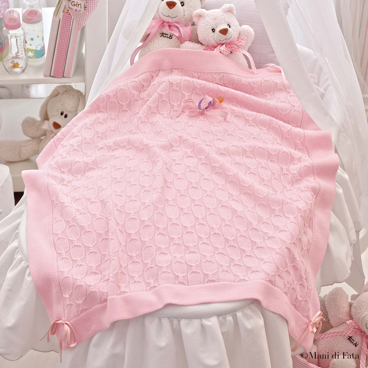Copertina per culla e carrozzina che unisce dolcezza e pregio artigianale, pensata per avvolgere il tuo bambino in un caldo abbraccio di morbidezza e stile. Realizzata in pura lana vergine rosa, è arricchita da dettagli raffinati che la rendono unica.