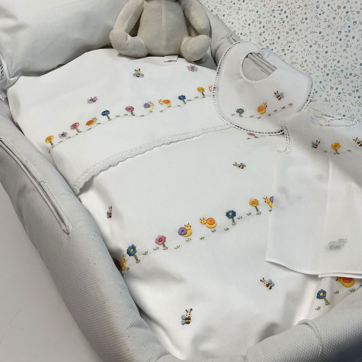 Copertina a sacco da culla e da carrozzina confezionata in piquet millerighe di cotone bianco ricamata a mano con motivo chioccioline nel prato, balze lungo i bordi e finizione pizzo. Possibilità d'inserire l'imbottitura per il periodo più freddo. Prodotto realizzato in Italia