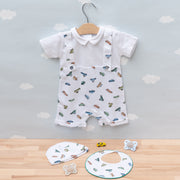 Pagliaccetto corto a manica corta con elegante colletto a punta, pratico e confortevole per il tuo bambino. Il corpetto in jersey di cotone bianco presenta una simpatica finta salopette, mentre la parte inferiore è realizzata con una vivace stampa a macchinine.