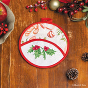 Un accessorio pratico e decorativo che porta la magia del Natale anche in cucina. La presina è già confezionata in tessuto di cotone con fantasia natalizia e presenta una taschina in tela Aida, pensata per essere personalizzata con un piccolo motivo augurale ricamato a punto croce.