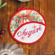 Un accessorio pratico e decorativo che porta la magia del Natale anche in cucina. La presina è già confezionata in tessuto di cotone con fantasia natalizia e presenta una taschina in tela Aida, pensata per essere personalizzata con una piccola scritta augurale, ricamata a punto croce.