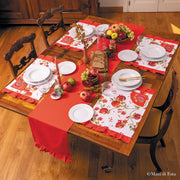 A completare l’apparecchiatura, un runner in cotone rosso coordinato, rifinito con rouches per un tocco di eleganza in più.