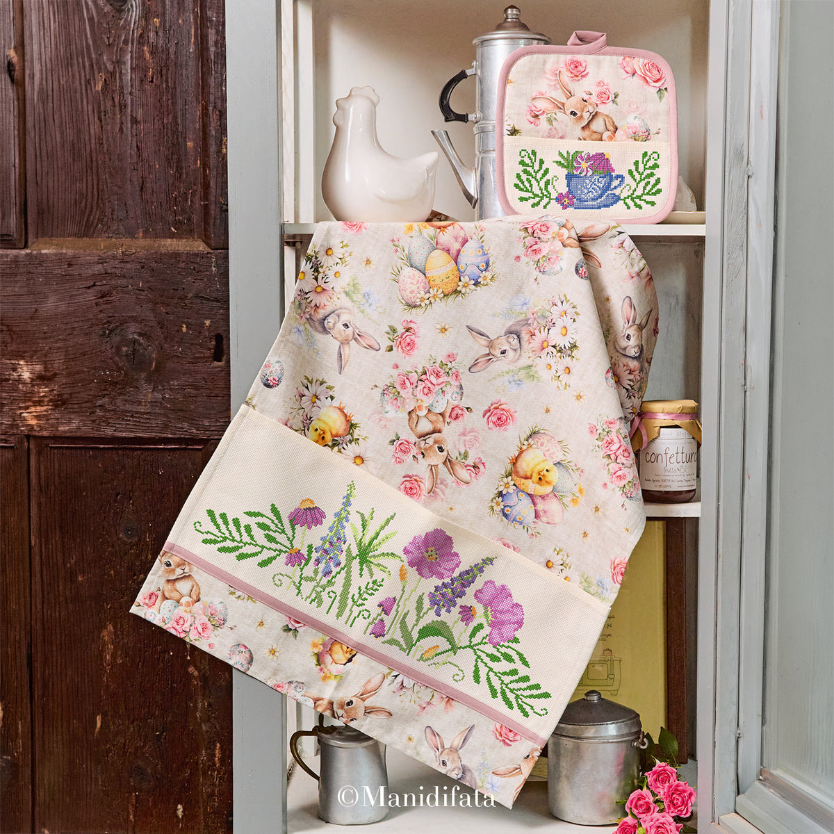 Un progetto creativo e primaverile per realizzare un asciugapiatti ricamato a punto croce, perfetto per decorare la cucina con delicate atmosfere pasquali. La stampa con ricami floreali dai colori pastello, uova decorate e teneri pulcini crea una base dolce e armoniosa, arricchita da applicazione in tela Aida avorio pronta da personalizzare.