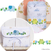 Kit busta fasciatoio e porta lavette azzurri con motivo animaletti e inserti in tela aida da ricamare a punto croce con dolcissimi animaletti tra i fiori, 8 matassine di Mulinè e lo schema a colori per realizzare i ricami.