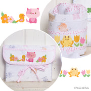 Kit busta fasciatoio e porta lavette rosa con motivo animaletti e inserti in tela aida da ricamare a punto croce con dolcissimi animaletti tra i fiori, 8 matassine di Mulinè e lo schema a colori per realizzare i ricami.