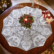 Kit completo composto da schema su carta a quadretti e occorrente per realizzare un elegante centro rotondo a uncinetto filet con motivo natalizio paesaggio innevato. Il design è strutturato in due motivi di 10 spicchi che si alternano, formando un grande centro a settori ideale per decorare la casa con un tocco festivo e artigianale. Diametro finito: circa 96 cm.