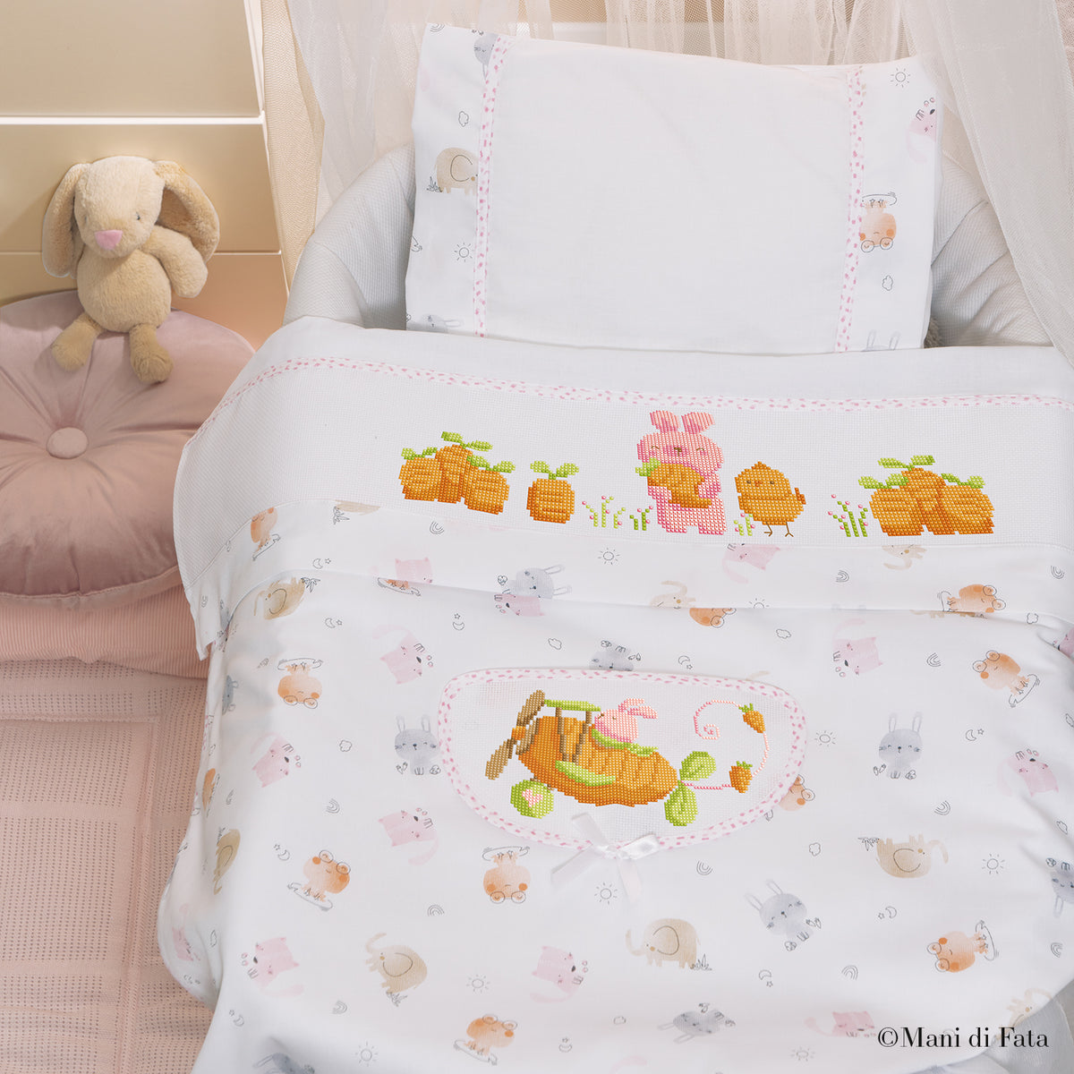 Un progetto dolce e creativo per accompagnare il riposo del tuo piccolo con stile e tenerezza. La copertina rosa diventa unica grazie alla tasca ricamabile con l’allegro coniglio in aeroplano.