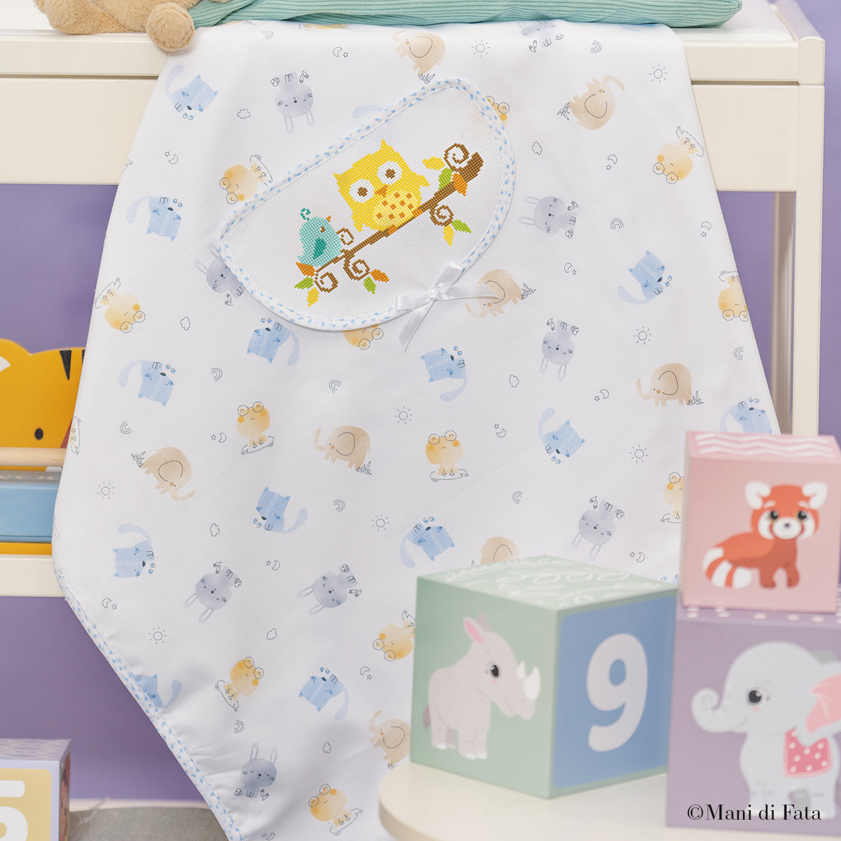 Un progetto tenero e allegro che unisce praticità e creatività. La copertina in cotone, morbida e confortevole, diventa unica grazie alla tasca ricamabile a punto croce con simpatici gufetti colorati.