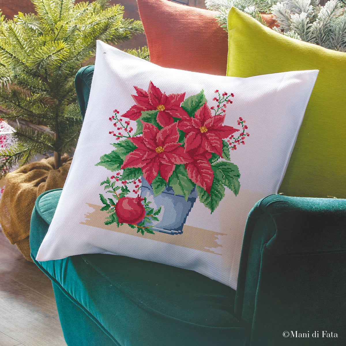 Un progetto elegante e ricco di significato per decorare la casa durante le feste. Il cuscino, già confezionato in tessuto Aida di cotone, diventa la tela perfetta per un raffinato ricamo a punto croce raffigurante uno sfarzoso vaso colmo di stelle di Natale e un melograno augurale, simbolo di prosperità e buon auspicio.