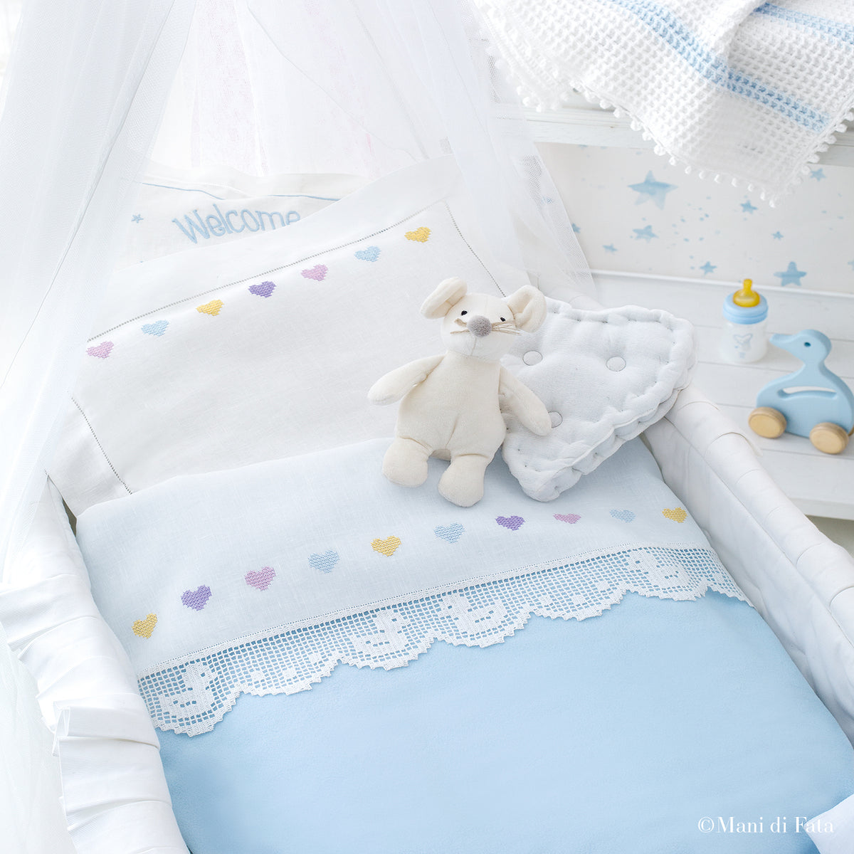Kit taglio tela per lenzuolino e federina culla, in puro cotone pelleovo bianco disegnato con piccoli cuoricini da ricamare a punto croce con 4 matassine di cotone Mulinè e la delicata bordura a filet con motivo paperelle da realizzare con 1 gomitolo di Cordonetto Mercher Crochet n° 40 bianco. Completa il kit la matassina di ricamo bianco n°25 per l'unione del pizzo al tessuto.