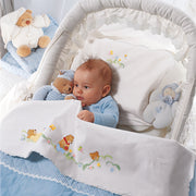 Kit completo composto da lino disegnato bianco e 15 matassine di cotone Mulinè per ricamare a punti misti il set di lenzuola culla completo di federa con motivo 'Tre orsetti'.