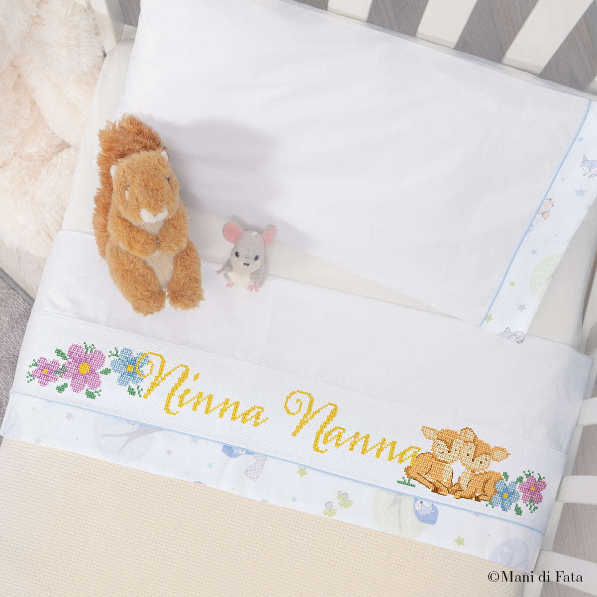 Kit Lenzuolino Lettino Ricamabile – Motivo Cerbiatti Ninna Nanna Un progetto dolce e raffinato per completare il corredino del tuo bambino con stile e tenerezza. Il ricamo a punto croce trasforma lenzuolino e federa in un accessorio unico e personale.