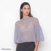 Kit completo composto da filato e spiegazioni per realizzare la maglia da donna azzurro chiaro taglia 42/44 con motivo traforato, scollo a V sulla schiena e maniche tre quarti con taglio a palloncino. Un progetto elegante e femminile, perfetto per chi ama creare capi leggeri e raffinati con le proprie mani.