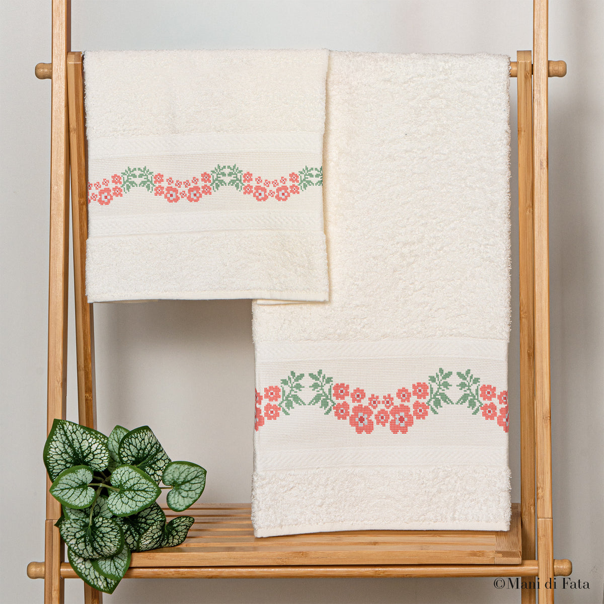 Kit completo composto da coppia di asciugamani avorio, occorrente e schema per realizzare a punto croce un elegante ramage di fiori. Un progetto delicato e raffinato, perfetto per impreziosire la biancheria bagno con un ricamo fatto a mano dal fascino senza tempo.