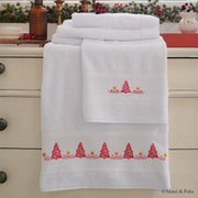 Un’idea raffinata per aggiungere un tocco natalizio anche ai momenti di relax. La parure spugna confezionata in morbido cotone bianco presenta un inserto in Aida da personalizzare con una delicata grechina di alberelli rossi, semplice da realizzare ma di grande effetto.