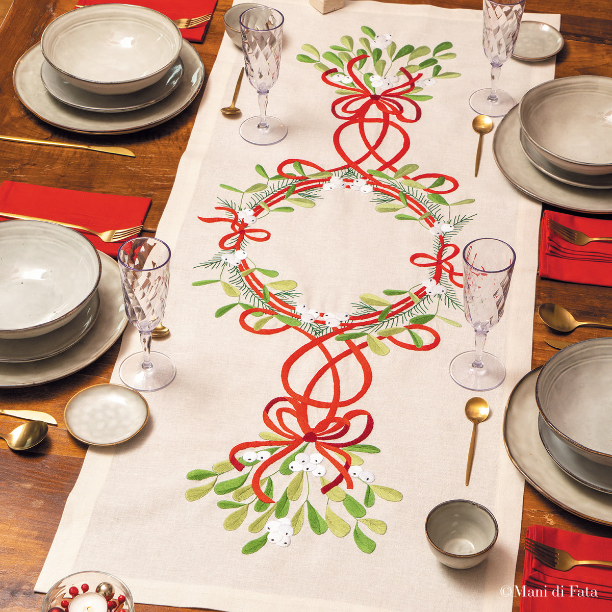 Il soggetto proposto è un intreccio di vischio con nastri e fiocchi, da ricamare a punto croce con un effetto pittorico che rende il risultato particolarmente realistico e prezioso, un kit adatto alle ricamatrici più esperte, che amano cimentarsi con progetti complessi e di grande effetto, perfetti da esporre o regalare.