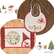 Kit set completo composto da tovaglietta americana con tovagliolo e bavetta rotonda già confezionati, occorrente e schemi per il ricamo a punto croce.