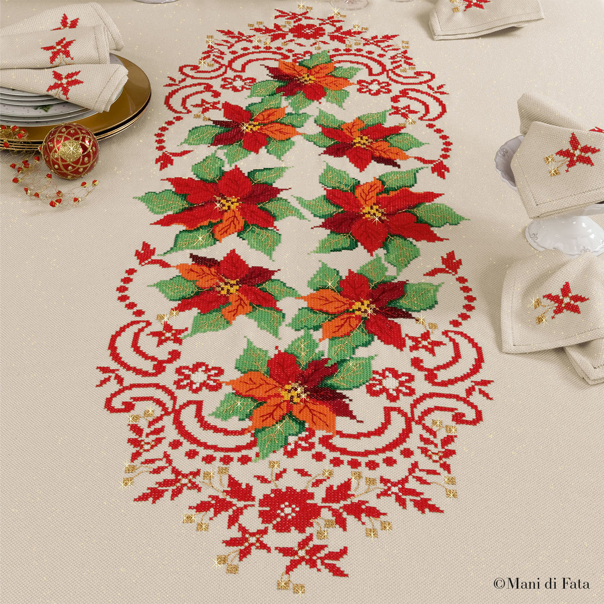 Un progetto prestigioso e raffinato, pensato per rendere la tavola natalizia davvero unica. La tovaglia è realizzata in tela Aida di cotone con filo oro con 12 tovaglioli che completano l'apparecchiatura, elegante e luminosa, ideale per lavori di ricamo a punto croce di grande effetto.