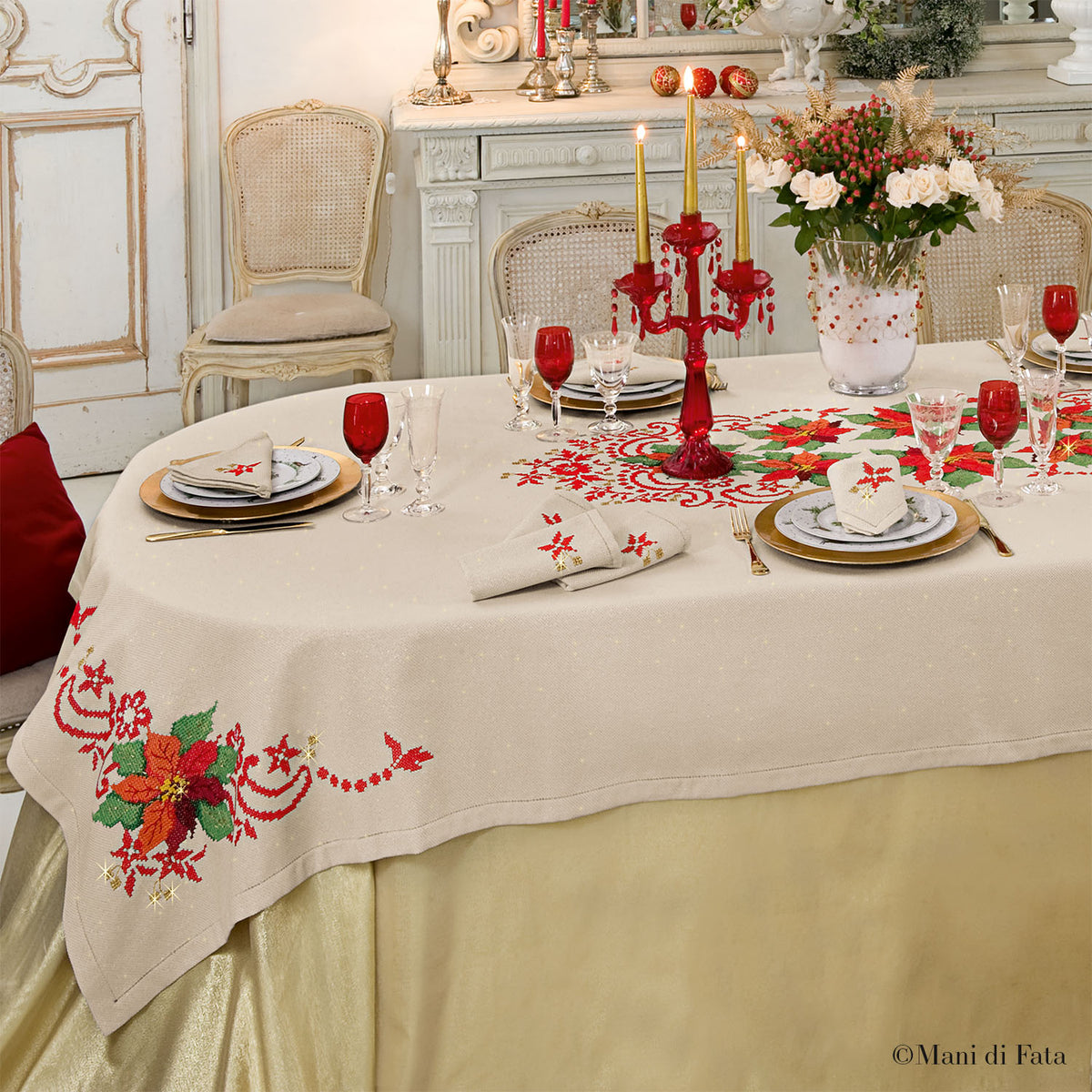 Un progetto prestigioso e raffinato, pensato per rendere la tavola natalizia davvero unica. La tovaglia è realizzata in tela Aida di cotone con filo oro con 8 tovaglioli che completano l'apparecchiatura, elegante e luminosa, ideale per lavori di ricamo a punto croce di grande effetto.
