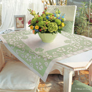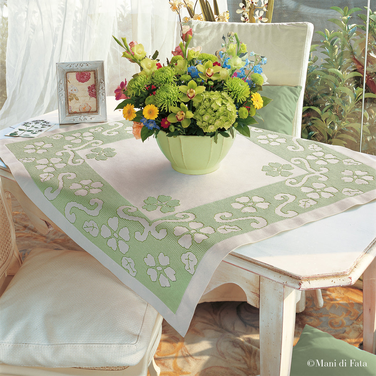 Kit per tovaglietta quadrata in tela Aida di cotone bianco, da confezionare con orlo a piacere, ideale per personalizzare la finitura secondo il proprio stile, Il disegno si ispira alla tecnica del ricamo Assisi, reinterpretata in chiave moderna sui toni del verde, così da inserirsi armoniosamente anche in un living giovane e contemporaneo.