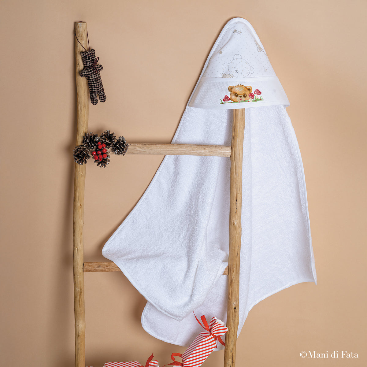 Accappatoio triangolo in morbida spugna bianca con applicazioni fantasia orsetti e inserto in tela Aida da ricamare a punto croce, ideale comw regalo nascita o per creare un capo personalizzato e unico.