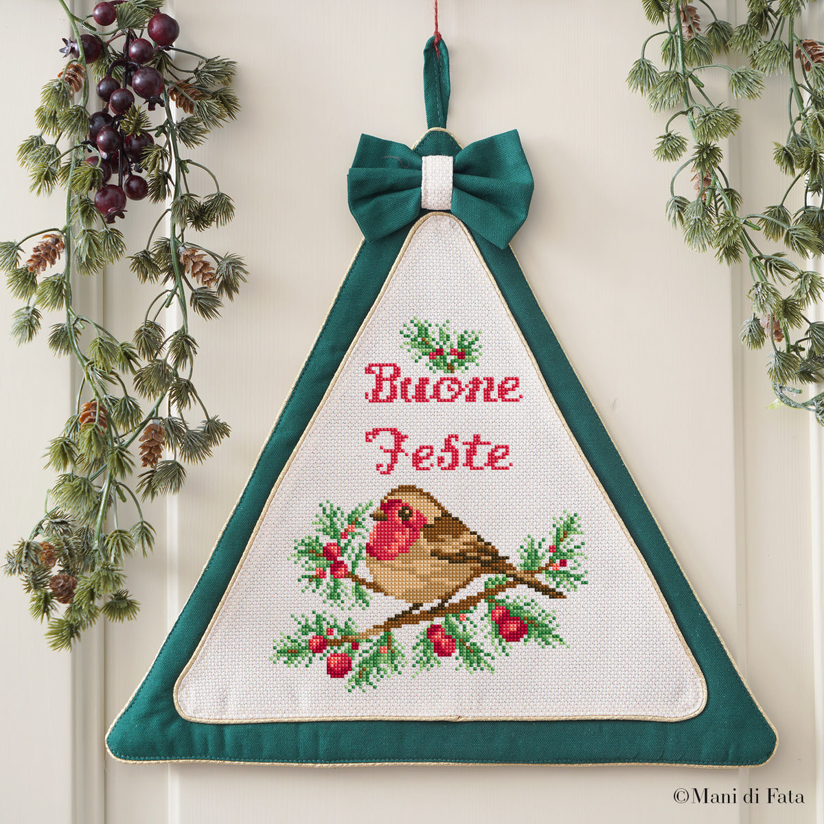 Fuoriporta ad alberello in cotone verde con inserto in tela Aida per ricamo a punto croce