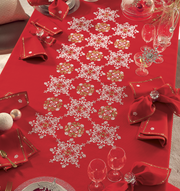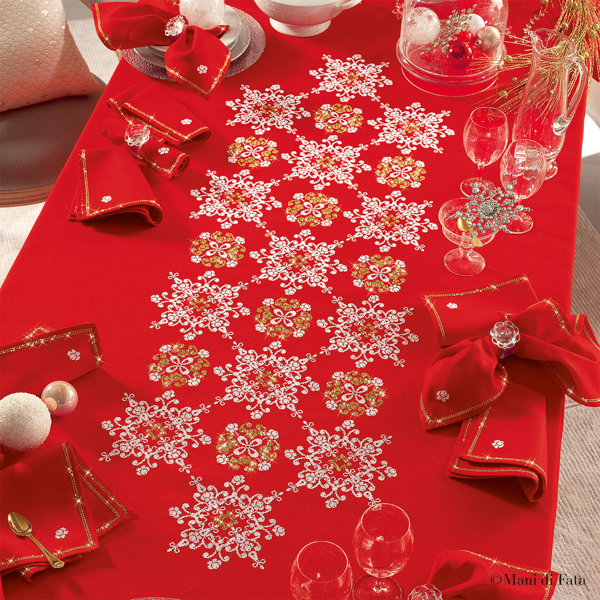 Un progetto elegante e luminoso per impreziosire la tavola delle feste. Il taglio tela, adatto a una tovaglia per 8 persone, compreso di tovaglioli è realizzato in Aida di cotone rosso, perfetta per eseguire ricami a punto croce di grande effetto, da rifinire con orlo a piacere, Il soggetto proposto è un motivo natalizio con ornati bianchi e dettagli in oro, che unisce tradizione e raffinatezza.