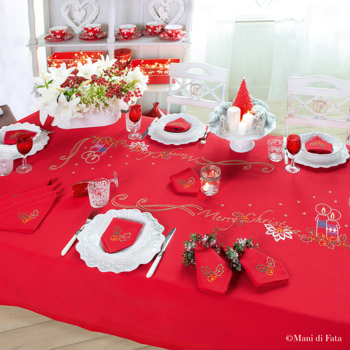 Kit tovaglia rossa disegnata "Merry Christmas" per 12 persone