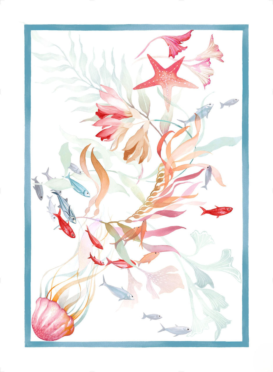 Asciugapiatti in puro lino stampato, dal design elegante e ricercato, ideale per portare in cucina uno stile fresco e marino. La fantasia combina motivi marini e floreali, arricchita da dettagli ispirati ai coralli nei toni vivaci di rosso, arancio e turchese, il tutto racchiuso all’interno di una cornice decorativa.