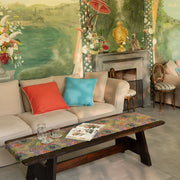 Il runner è decorato con un motivo floreale multicolore a campo pieno, caratterizzato da grandi fiori stilizzati simili a margherite con centri audaci e foglie verdi, che conferiscono un effetto luminoso e raffinato.