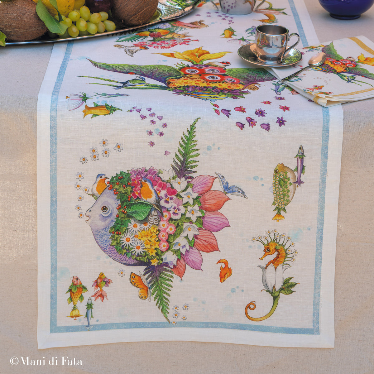 Runner in puro lino stampato misura 45x170 cm, caratterizzato da un design esclusivo che unisce armoniosamente elementi marini e floreali. Pesci e fiori si fondono in un delicato giardino acquatico, creando un effetto raffinato e naturale, perfetto per donare freschezza e stile alla tavola. Realizzato con materiali di alta qualità e cura artigianale Made in Italy.