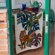 Runner da tavola 45x170 cm in misto lino, con elegante stampa su fondo ecrù che raffigura foglie tropicali e maestosi felini. Rifinito con orlo semplice, unisce praticità e design ricercato. Realizzato in Italia, è ideale per dare carattere e stile alla tua tavola.