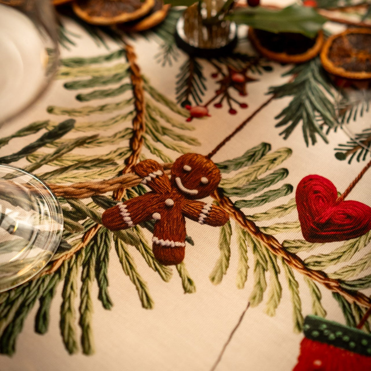 Runner natalizio in puro cotone che porta sulla tavola la magia delle feste con un design delicato e luminoso. Su fondo bianco naturale si rincorrono abeti, calze, stelline, renne e doni, creando un’atmosfera calda e accogliente per i tuoi pranzi e cene di Natale.