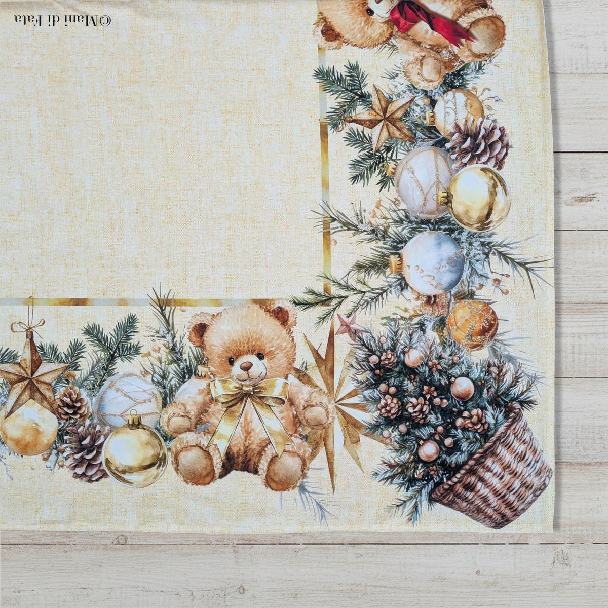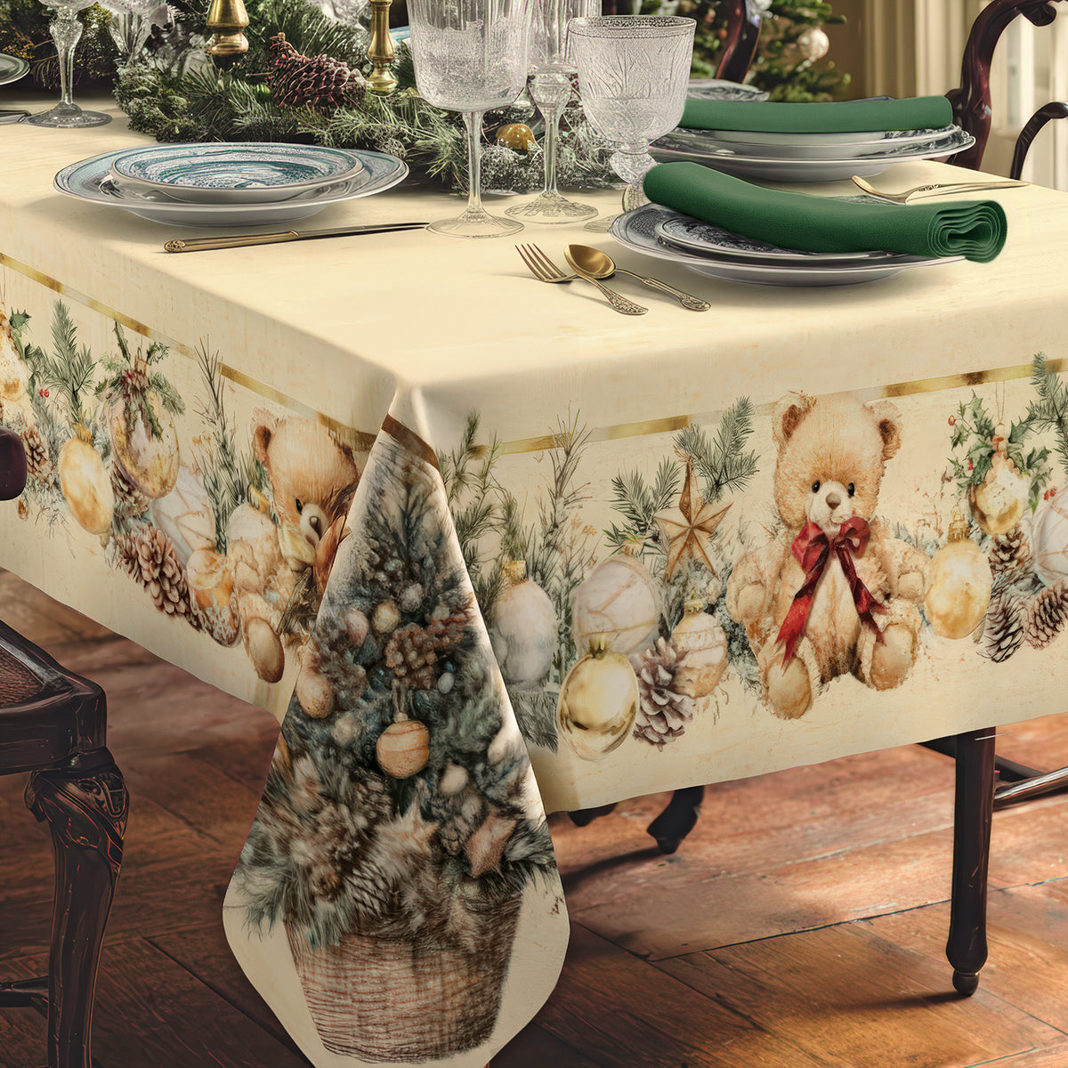 Tovaglia natalizia da 8 posti in puro cotone che unisce eleganza e allegria, perfetta per trasformare la tua tavola in un angolo di festa. Il centro beige chiaro dona luminosità, mentre il bordo stampato con elementi natalizi e i simpatici orsetti rendono il design caldo e accogliente, ideale per pranzi e cene festive.