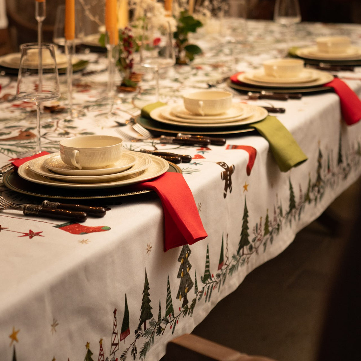 Tovaglia rettangolare natalizia da 8 posti che unisce praticità ed eleganza, perfetta per accogliere familiari e amici durante le feste. Realizzata in puro cotone, è impreziosita da una raffinata stampa con abeti ed eleganti addobbi natalizi che donano magia e colore alla tua tavola.