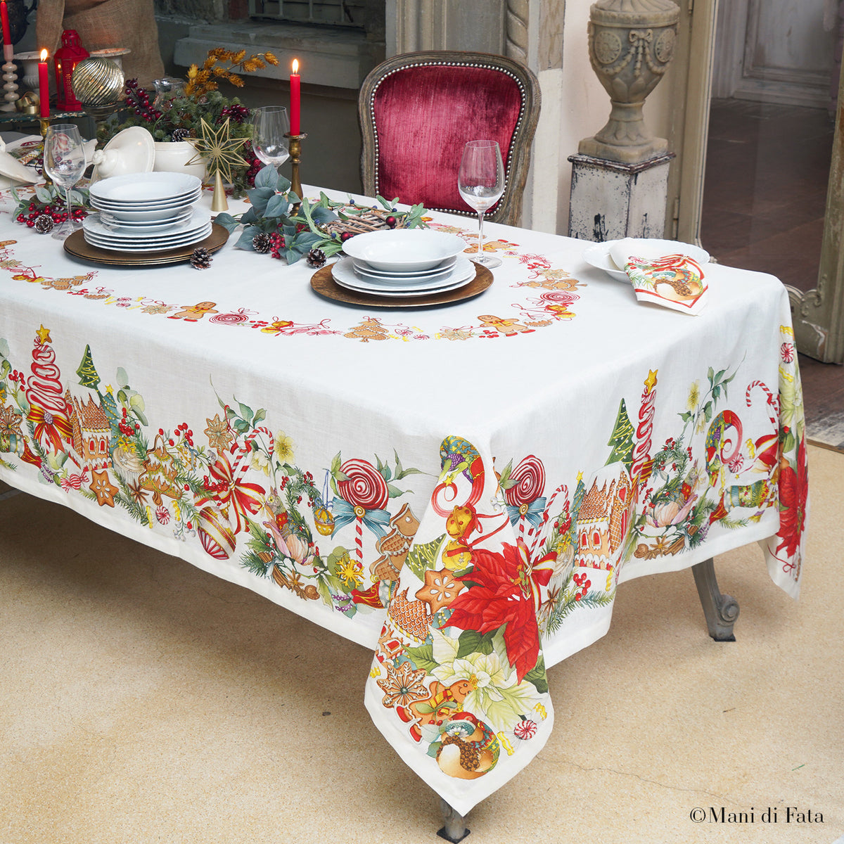 Tovaglia natalizia rettangolare da 8 posti che unisce tradizione e allegria, perfetta per trasformare ogni pranzo o cena delle feste in un momento speciale. Il pregiato lino e la vivace stampa ispirata al mondo del pan di zenzero regalano alla tavola un’atmosfera calda, accogliente e ricca di dettagli unici.