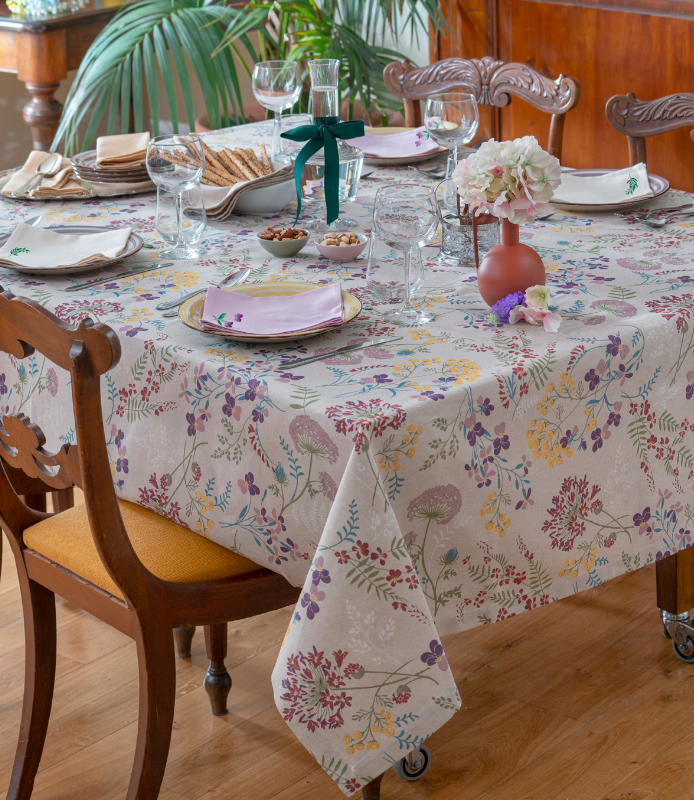 Tovaglia rettangolare da8 posti(misura160x230 cm) realizzata inmisto cotonedi alta qualità, constampa floreale a campo pienosu fondo grezzo. Perfetta per aggiungere un tocco di colore e naturale eleganza alla tavola quotidiana o alle occasioni speciali.