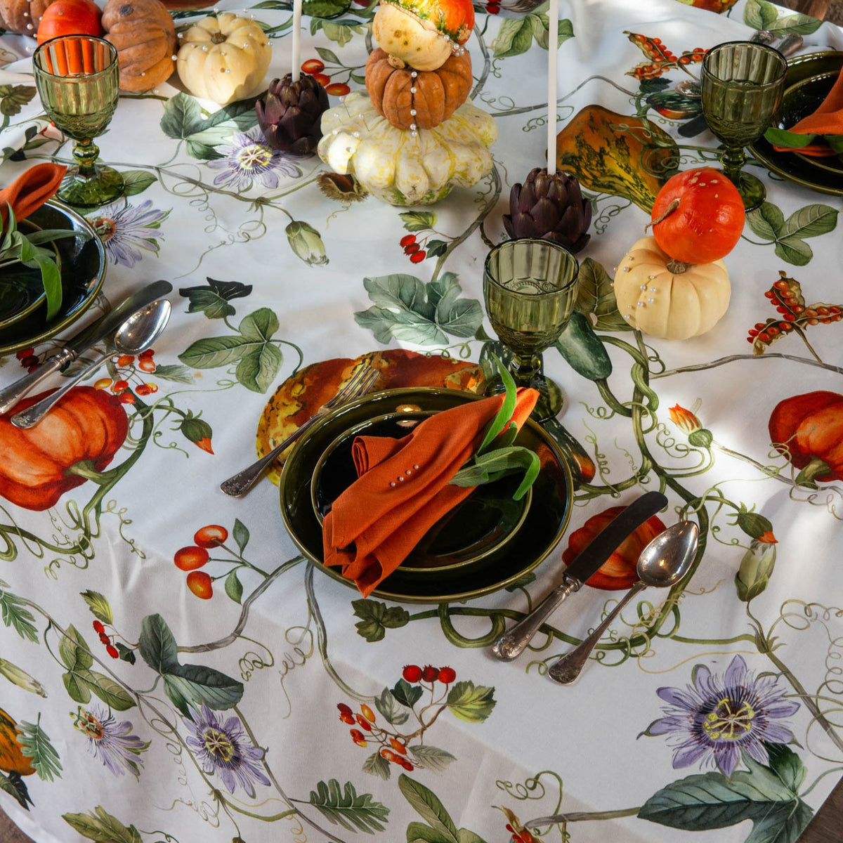 Tovaglietta in Panama di cotone che unisce eleganza e funzionalità, perfetta per portare in tavola un tocco di stile autunnale e raffinatezza. La stampa di zucche e fiori su fondo bianco naturale crea un’atmosfera calda e accogliente.