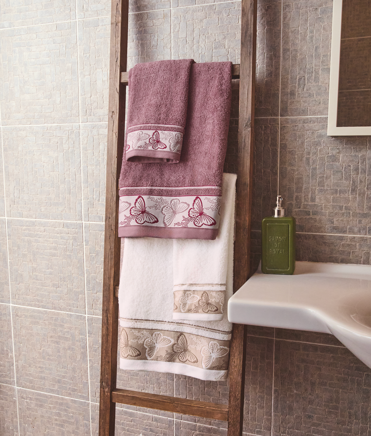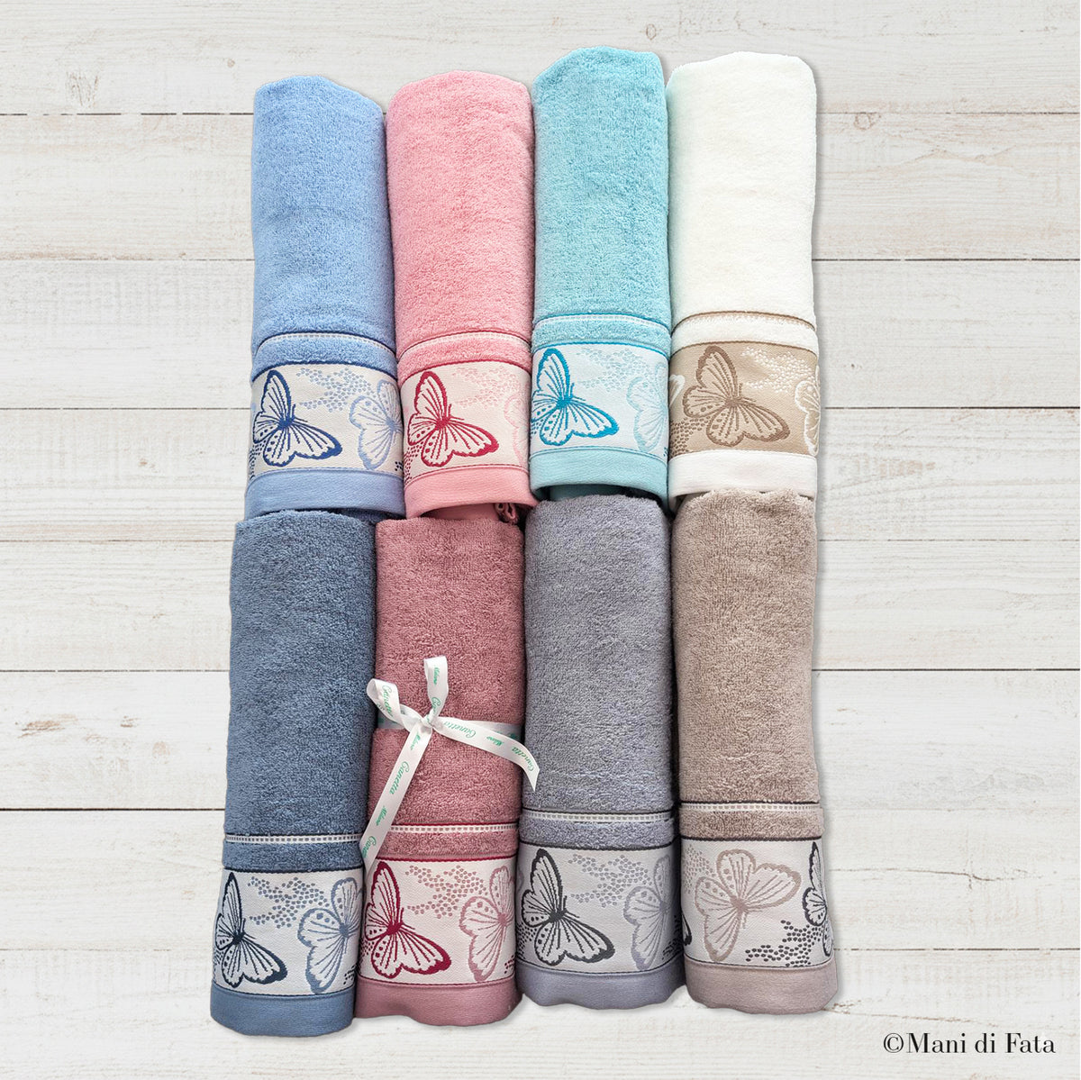 Coppia asciugamani in morbida spugna frizzante 450 gsm, pensata per portare un tocco di freschezza e colore alla tua quotidianità. Le balze ricamate con delicate farfalle aggiungono un dettaglio raffinato, trasformando un gesto semplice in un piccolo momento di piacere.