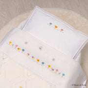 Lenzuolino da culla e carrozzina confezionato in puro cotone bianco, morbido e traspirante, ideale per la pelle delicata del neonato. È impreziosito da un raffinato ricamo realizzato a mano con motivo chioccioline, simbolo di dolcezza e cura artigianale. La finitura in pizzo di cotone aggiunge un tocco elegante e delicato, perfetto per la prima culla del tuo bambino.