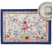 Delicato set di 2 tovagliette all’americana, stampate su fondo bianco con un raffinato motivo di primule racchiuse all’interno di una cornice blu, ideale per portare sulla tavola un tocco fresco, luminoso e primaverile.