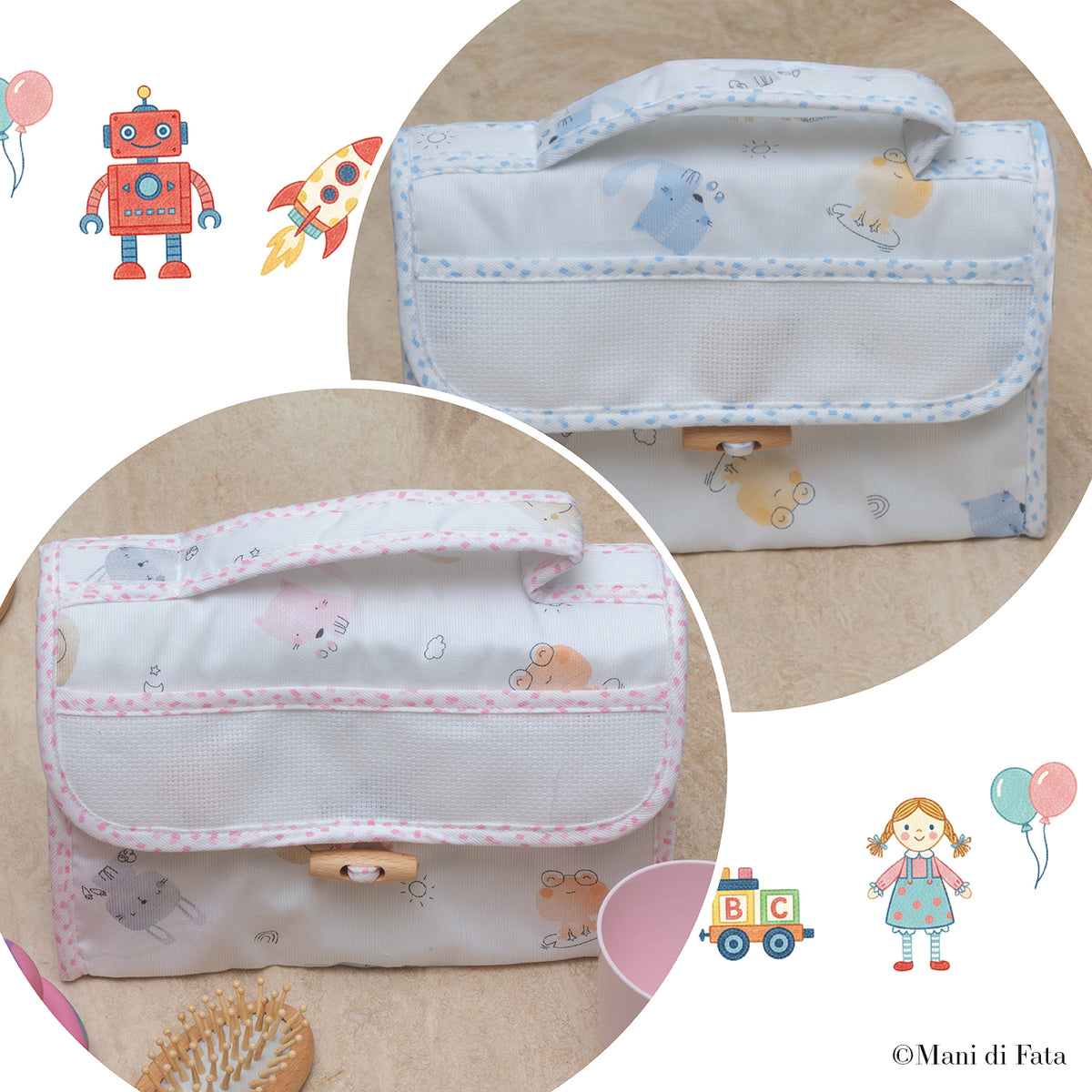 Beauty neonato con inserto in tela Aida pronto per essere personalizzato con ricamo a punto croce, ideale per custodire con ordine gli accessori del bebè. Il motivo con dolci animaletti dona un tocco tenero e allegro, perfetto per i primi mesi di vita.